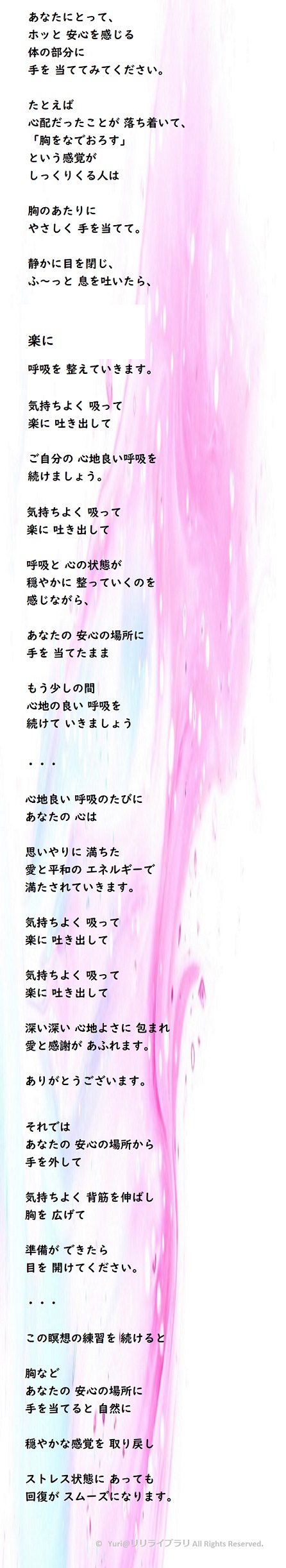 ※リリライブラリの台本や音源などの著作権はYuriにあります。有料レッスンでの使用や、台本を読み上げ録音してオンラインで公開・収益化もOKですが、台本をテキスト形式(文字のかたち)で配布・公開すること、Yuriの音源を他所で販売したり、2次配布することは禁止です。